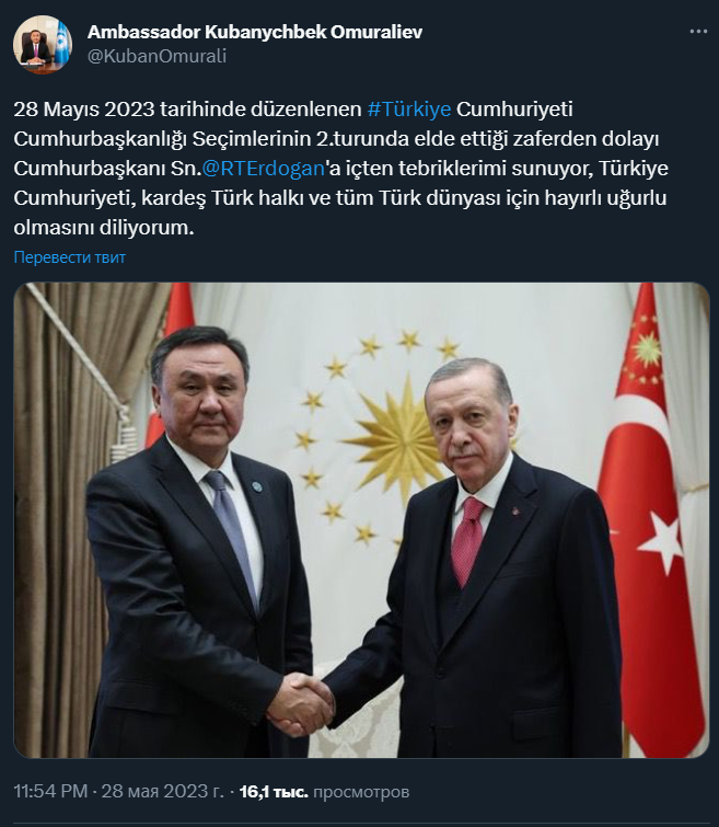 Генсек Организации тюркских государств (ОТГ) Омуралиев поздравил Эрдогана с победой на президентских выборах (Twitter-аккаунт Омуралиева).