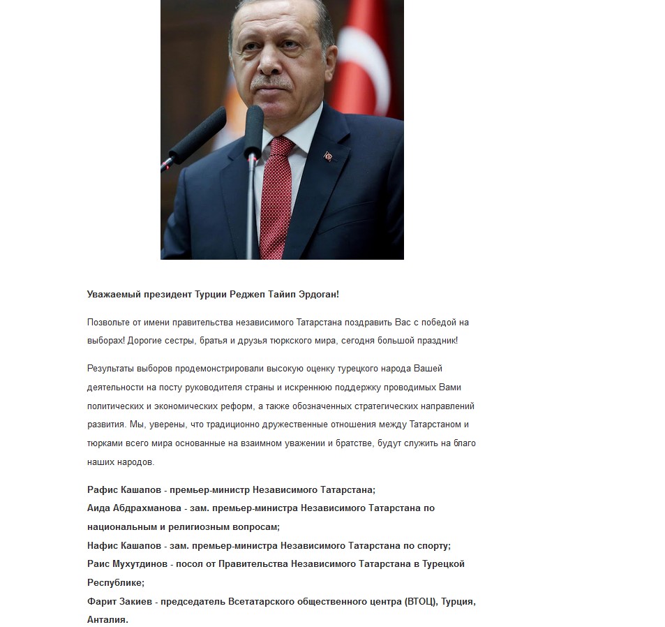Правительство Татарстана в изгнании во главе с премьером Рафисом Кашаповым поздравило Эрдогана с переизбранием на выборах