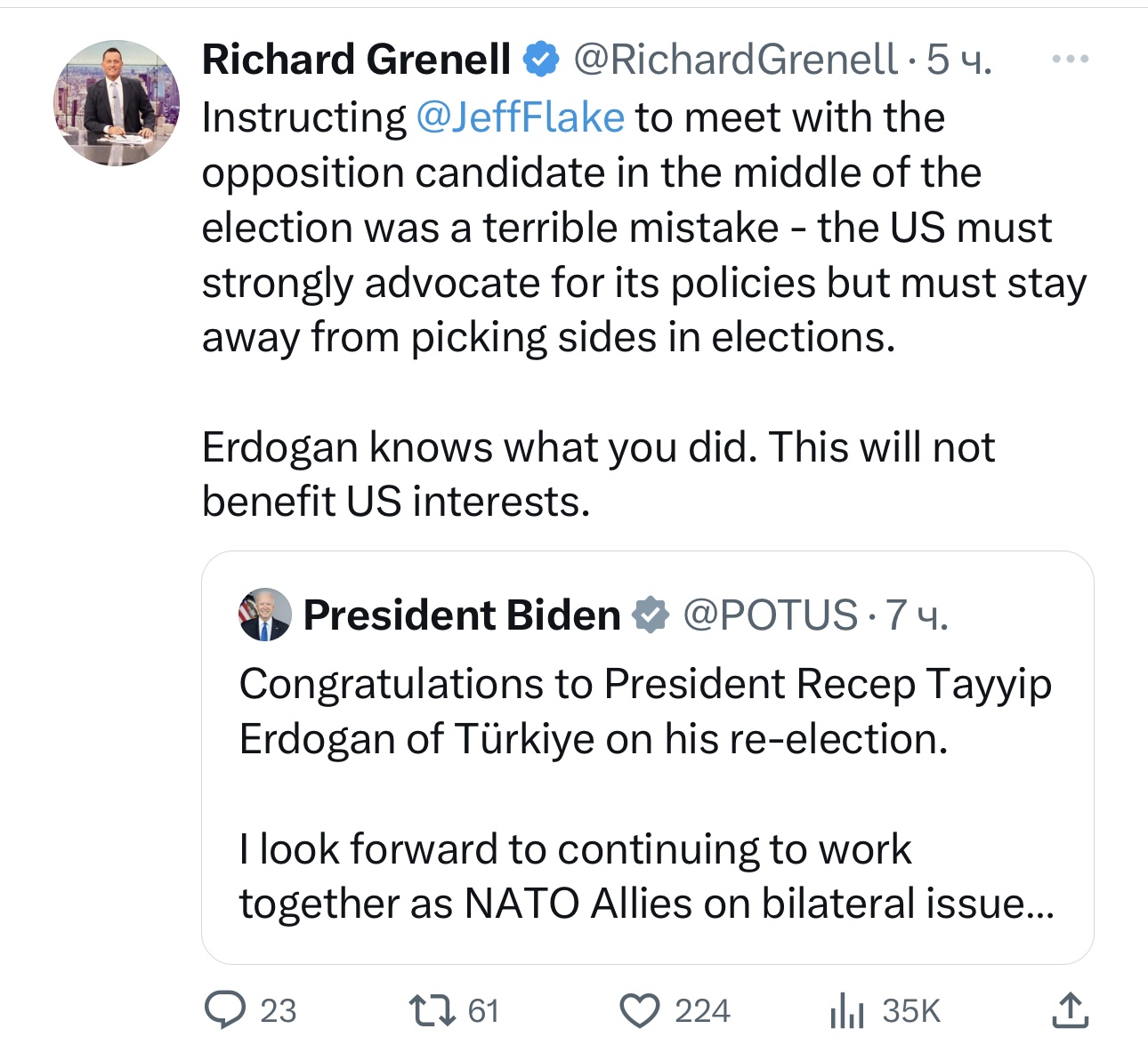 🇺🇸🇹🇷 «Поручить (послу США в Турции) встретиться с кандидатом от оппозиции в середине предвыборной кампании было ужасной ошибкой - США должны отстаивать свою политику, но не принимать чью-либо сторону на выборах. Эрдоган знает, что вы сделали. Это не будет служить интересам США», - написал экс-глава американской разведки, действующий посол США в Германии Греннел.