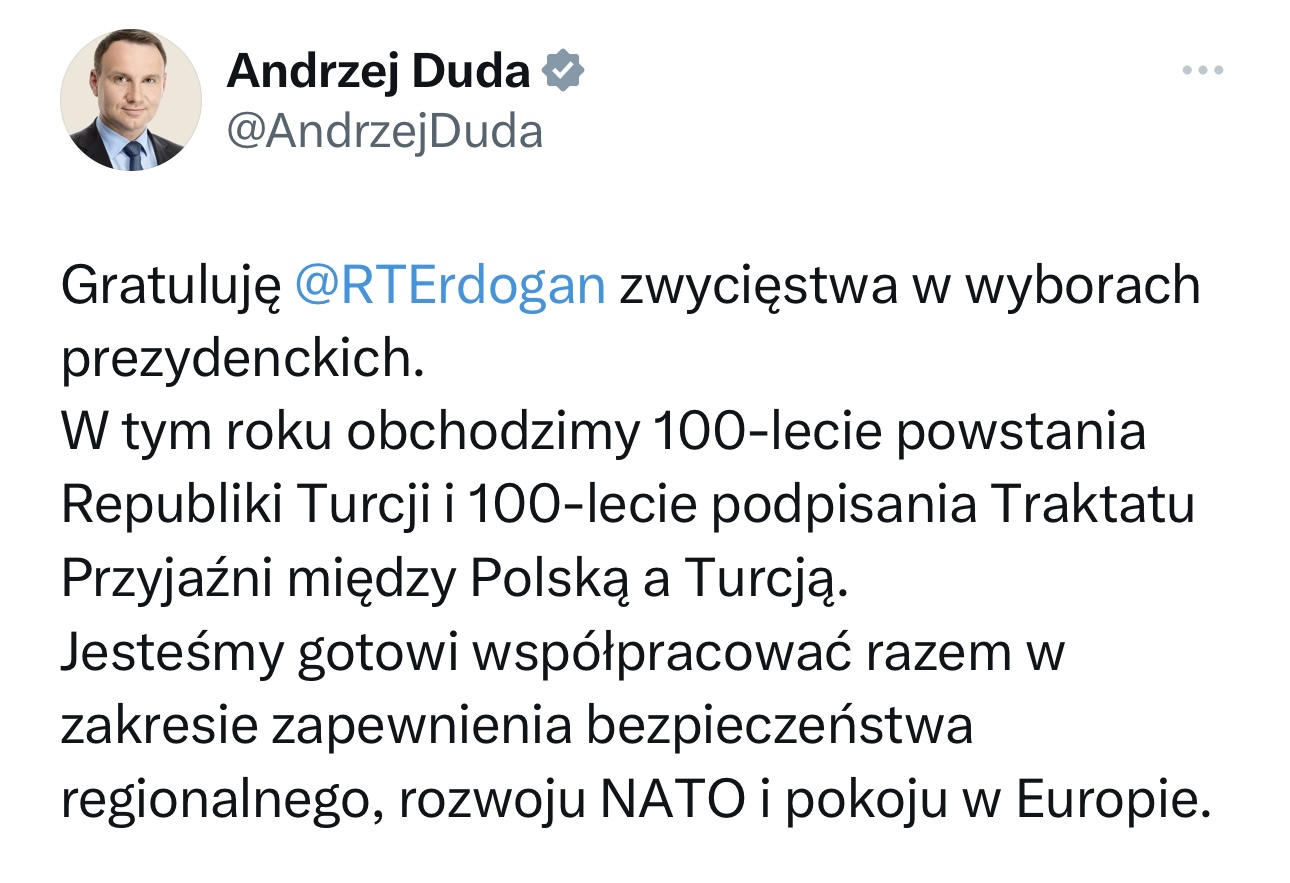 🇹🇷🇵🇱 Президент Польши Анджей Дуда поздравил Эрдогана с переизбранием: «В этом году мы отмечаем 100-летие образования Турецкой Республики и 100-летие подписания Договора о дружбе между Польшей и Турцией.