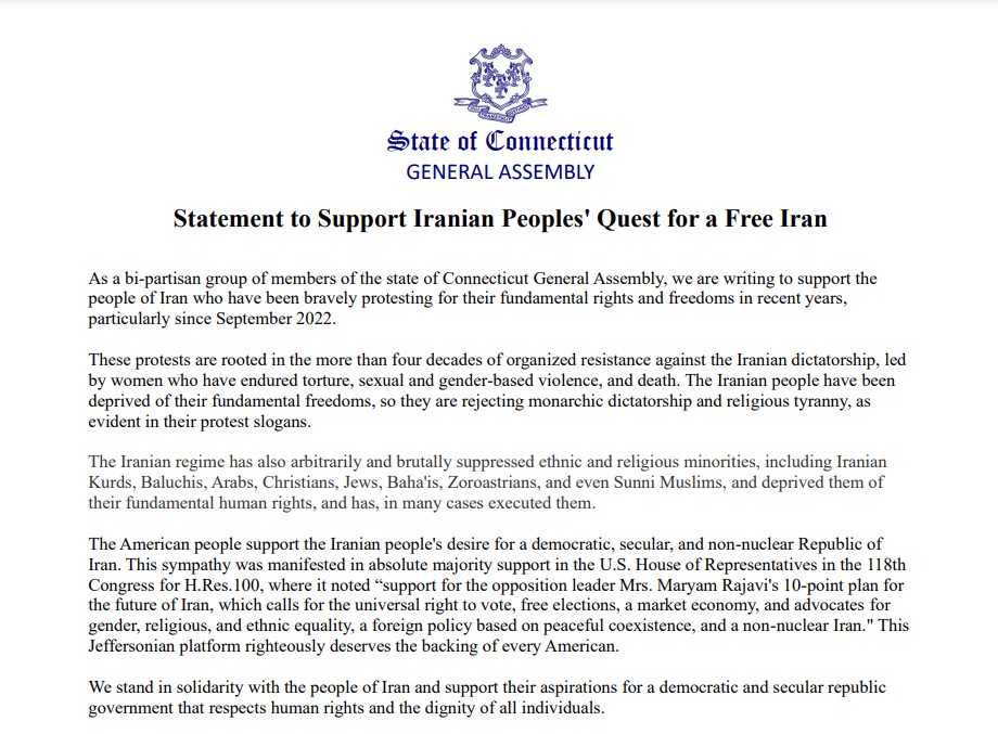 🇺🇸 Генассамблея штата Коннектикут в США выступила с заявлением поддержки стремления иранского народа к свободе в Исламской республике. Среди подписантов 85 членов Палаты представителей, состоящей из 151 члена, и 22 из 36 сенаторов штата. В заявлении обращается внимание на тот факт, что народ Ирана был лишен своих основных свобод и отверг как монархическую диктатуру, так и религиозный деспотизм, что проявляется в их лозунгах, озвучиваемых в ходе демонстраций (Iran Freedom Network).
