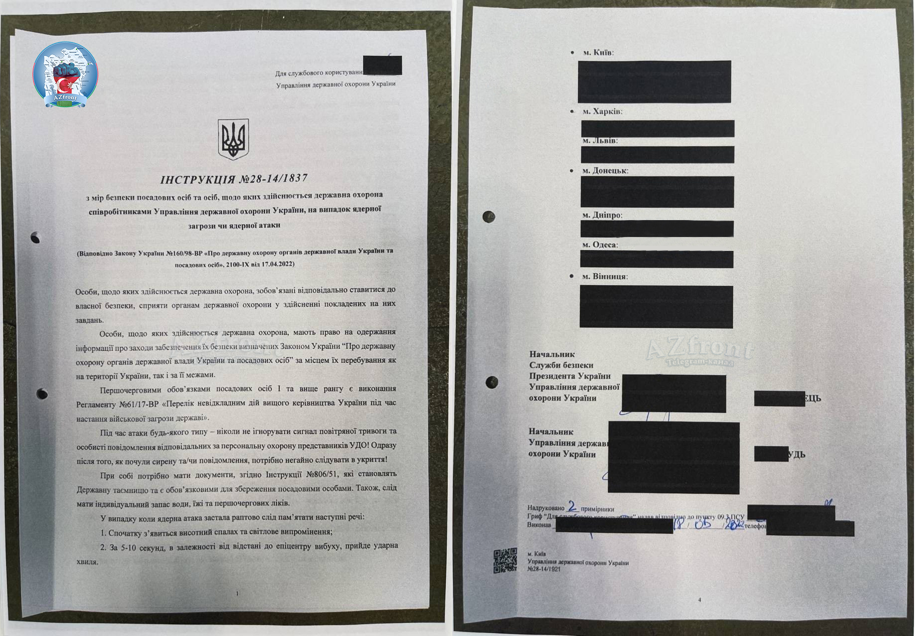 Четырехстраничный документ озаглавлен: «Инструкция №28-14/1921 по мерам безопасности должностных лиц и лиц, относительно которых осуществляется государственная охрана сотрудниками Управления государственной охраны Украины, на случай ядерной угрозы или ядерной атаки». Не желая раскрывать секретов Украины, документ полностью мы не публикуем (по тем же соображениям адреса секретных бомбоубежищ мы закрасили черным цветом). Но для подтверждения достоверности прикрепляем к этому сообщению коллаж из титульной страницы «инструкции» (слева) и финальный лист документа (справа).