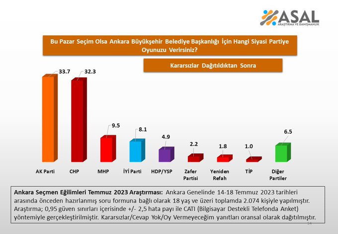 🇹🇷 Турецкая исследовательская компания Asal Araştırma обнародовала результаты первого опроса по муниципальным выборам по Анкаре. Согласно опросу, правящая партия AKP вышла вперед с 33,7% голосов. Она опередила оппозиционную CHP на 1,4% (Twitter-аккаунт ASAL Araştırma).