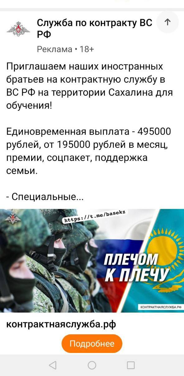Российские спецслужбы приглашают граждан Казахстана стать наемниками. По сообщению ТГ-канала БАСЕ, объявление опуликовано на страничке Службы по контракту ВС РФ в соцсети Вконтакте.