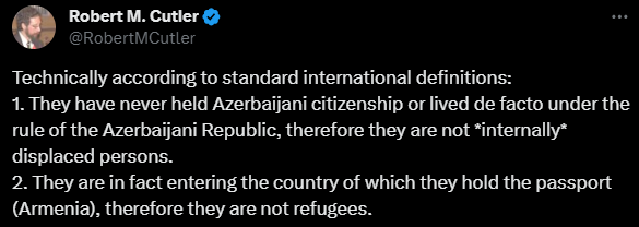 «Они (армяне Карабаха) фактически въезжают в страну, паспортом которой они владеют (Армению), поэтому они не являются беженцами», - заявил всемирно известный эксперт по региональной безопасности Роберт Катлер о возвращении армянского населения Карабаха в свое национальное государство - Армению.