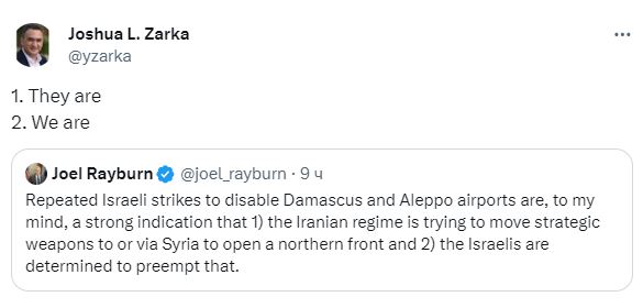 «Израильские удары с целью вывести из строя аэропорты Дамаска и Алеппо, на мой взгляд, являются убедительным свидетельством того, что 1) иранский режим пытается перебросить стратегическое оружие в Сирию или через нее, чтобы открыть фронт на севере и 2) израильтяне полны решимости предотвратить это», - отмечено в публикации Рейберна.
