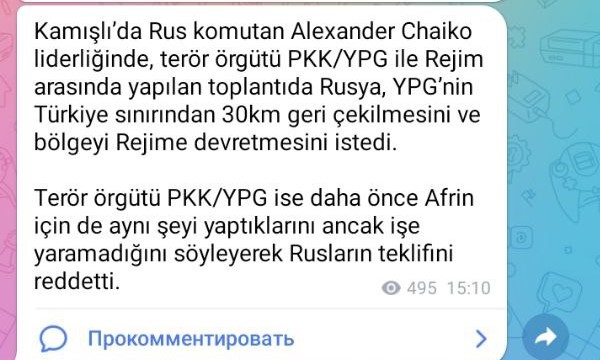 На встрече между представителями курдских террористических формирований PKK/YPG и режима президента Сирии Асада под руководством российского командира Чайко в Камышлы на северо-востоке Сирии, РФ попросила, чтобы YPG отошла на 30 км от турецкой границы и передала регион режиму. PKK/YPG отклонила предложение РФ (турецкий ТГ-канал GDH).