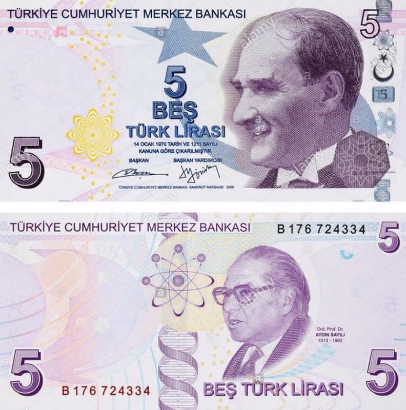 На реверсе бумажной банкноты Турции с номиналом в 5 лир изображён турецкий историк, религиовед и астроном Айдын Сайылы. Родился в 1913 г. и прожил 80 лет, до последних дней активно занимаясь исследовательской деятельностью.