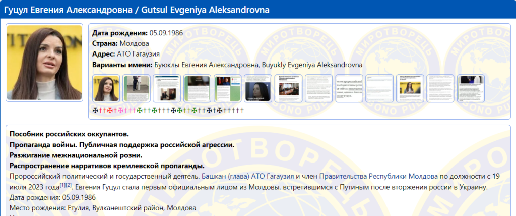 Глава Гагаузии Гуцул внесена в украинскую базу «Миротворец». На сайте ее называют «пособником российских оккупантов», указывая на ее участие в «пропаганде войны, поддержке российской агрессии, разжигании межнациональной розни и распространении кремлевских нарративов».