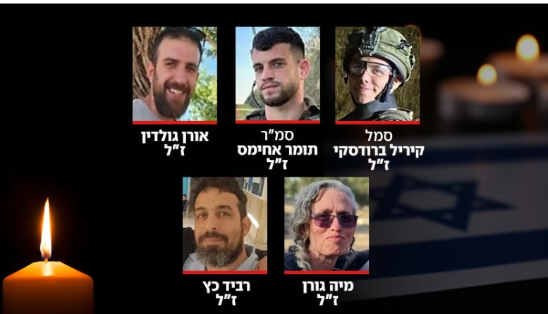 В ходе совместной операции армии Израиля и Службы общей безопасности (ШАБАК) в г. Хан-Юнес на юге сектора Газа найдены тела 5 израильтян, погибших в результате вторжения боевиков ХАМАСа на юг Израиля 7 октября 2023 г. Среди них: 56-летняя Майя Горен, 51-летний Равид Арье Кац, 33-летний Орен Голдин, 20-летний Томер Яаков Ахимас и 19-летний Кирилл Бродский (пресс-служба израильской армии).
