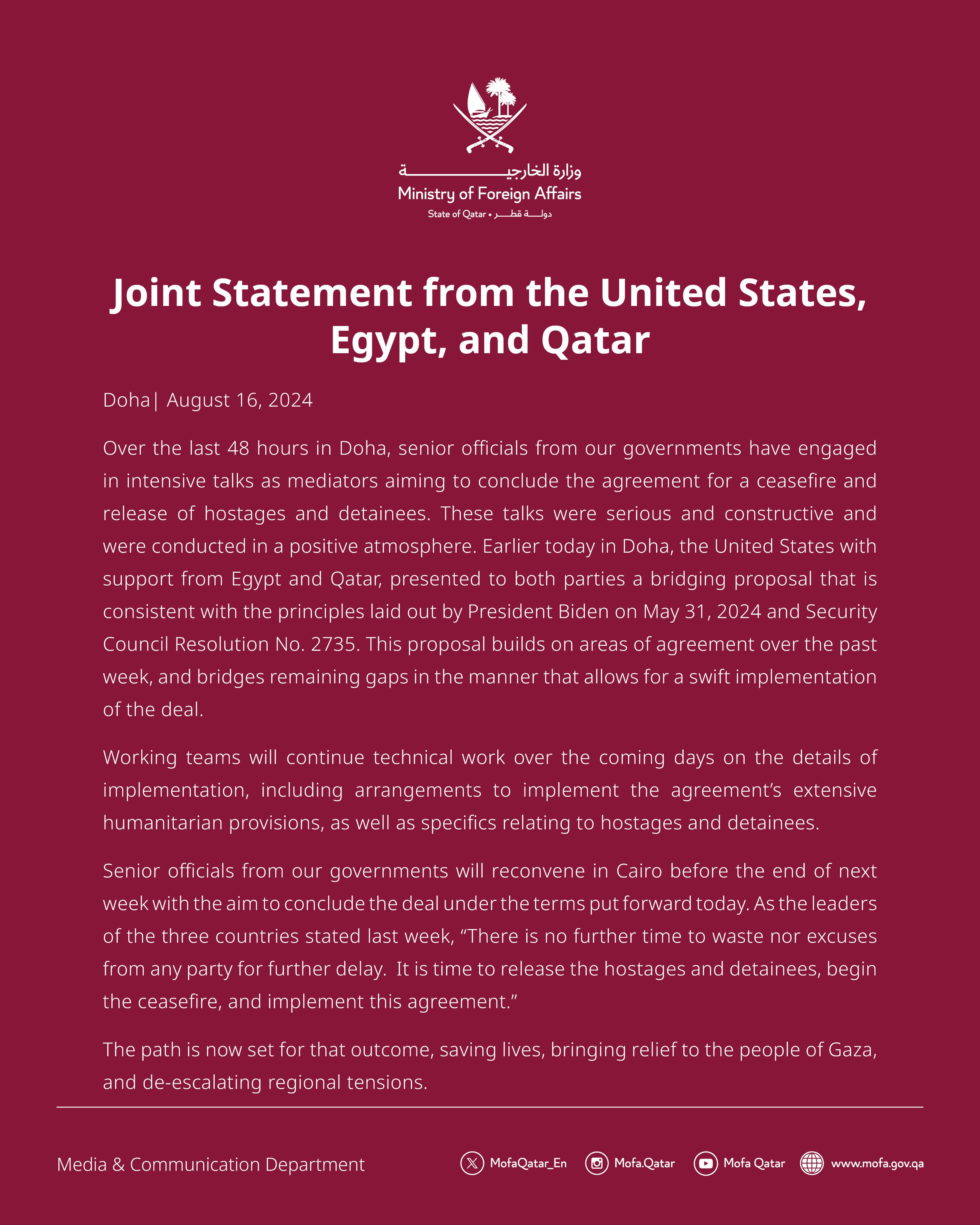 Переговоры в Дохе о прекращении огня в секторе Газа прошли в конструктивной и позитивной атмосфере. Стороны решили провести встречу в Каире до конца следующей недели. Об этом говорится в совместном заявлении Египта, Катара и США, обнародованном МИД Катара.
