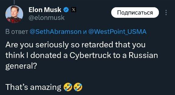 Американский миллиардер Маск заявил, что не дарил Кадырову электропикап Cybertruck. «Вы серьезно настолько тупой, что считаете, что я подарил Cybertruck российскому генералу? Поразительно», - ответил Маск одному из пользователей соцсети X (ранее Twitter), который обвинил миллиардера в поставке техники «врагу США».