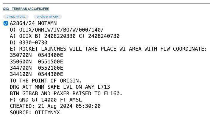 Иран закрыл воздушное пространство над провинцией Семнан на севере страны 22 августа с 3.30 до 7.30 утра. Отмечается, что это связано с проведением военных учений, во время которых будет производиться запуск ракет.