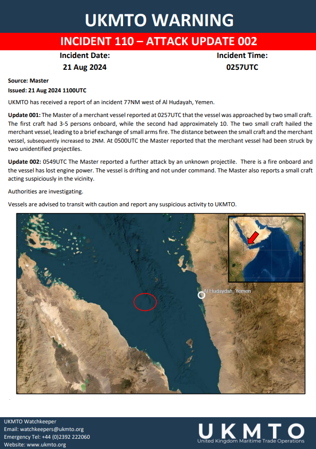 Агентство морских торговых операций Британии (UKMTO) сообщило об атаке на нефтяной танкер Sounion под флагом Греции, направляющийся к израильскому городу Эйлат. К судну подошли две лодки, на которых было ок. 15 вооруженных человек, после чего между ними и экипажем судна произошла перестрелка. Затем танкер был поражен тремя неопознанными снарядами и потерял управление.