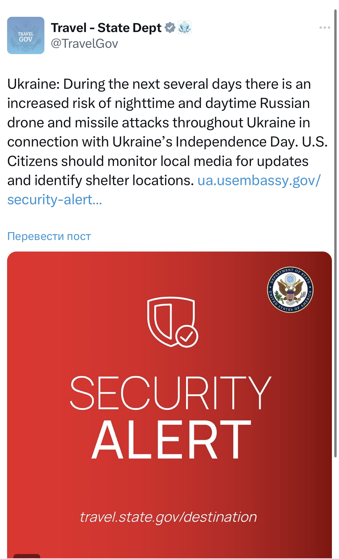 🇺🇸 Госдеп США призвал граждан в Украине определить расположение убежищ и следить за местными СМИ, в связи с повышенным риском атак «российских дронов и ракет по всей стране в связи с Днем независимости Украины».