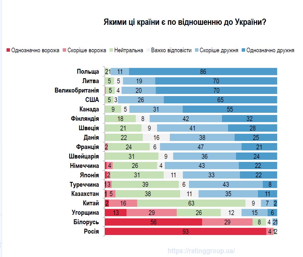 50% опрошенных украинцев считают Турцию дружественной страной. Польша, Литва, Великобритания, США и Канада оказались в первой пятерке. Венгрия же, по мнению опрошенных, является враждебной страной (социологической группы Рейтинг).