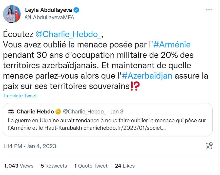 🇦🇿🇫🇷 Посол Азербайджана во Франции Абдуллаева прокомментировала опубликованную в журнале «Charlie Hebdo» статью, в которой утверждается, что Азербайджан представляет «угрозу для Армении»: