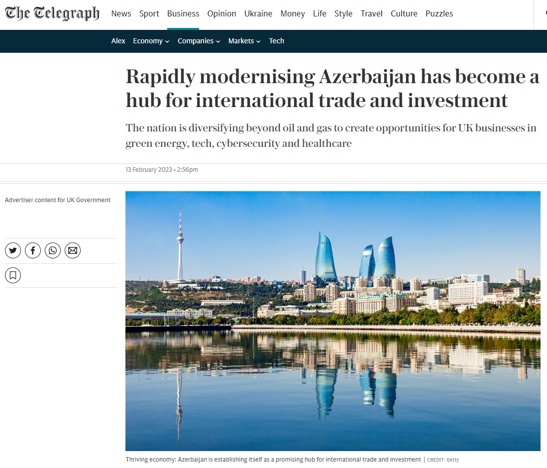 🇬🇧🇦🇿 Британская консервативная газета The Daily Telegraph: «Стремительно прогрессирующий Азербайджан стал центром международной торговли и инвестиций». Издание также подчеркивает, что Британия является крупнейшим иностранным инвестором страны с участием 450 компаний, включая BP.