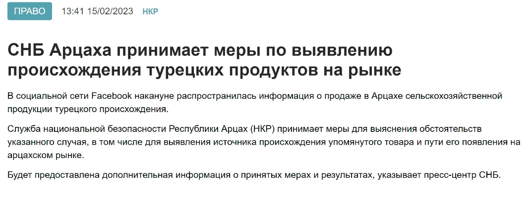 Судя по распространяемой ими информации, так называемая «Служба национальной безопасности Республики Арцах (НКР)» начала принимать меры для выявления источника попадания в этот сепаратистский анклав... турецкой сельскохозяйственной продукции. Особо выясняется, каким образом именно эта продукция появилась на рынках анклава.