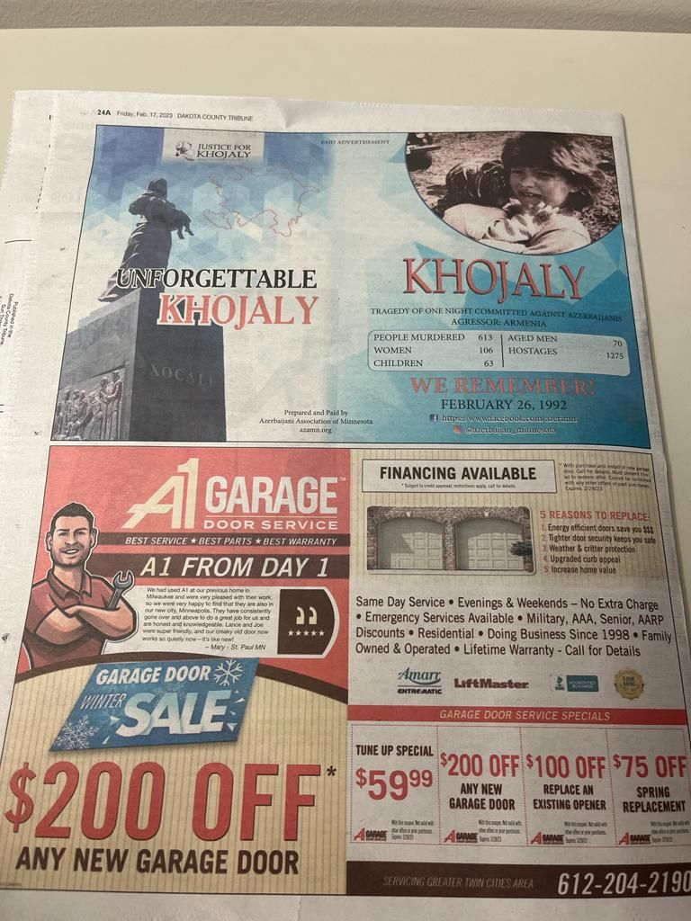 🇦🇿 Информация о 31-й годовщине Ходжалинского геноцида была опубликована в американских газетах «Dakota County Tribune» и «Sun This Week» (Госкомитет по работе с диаспорой АР).