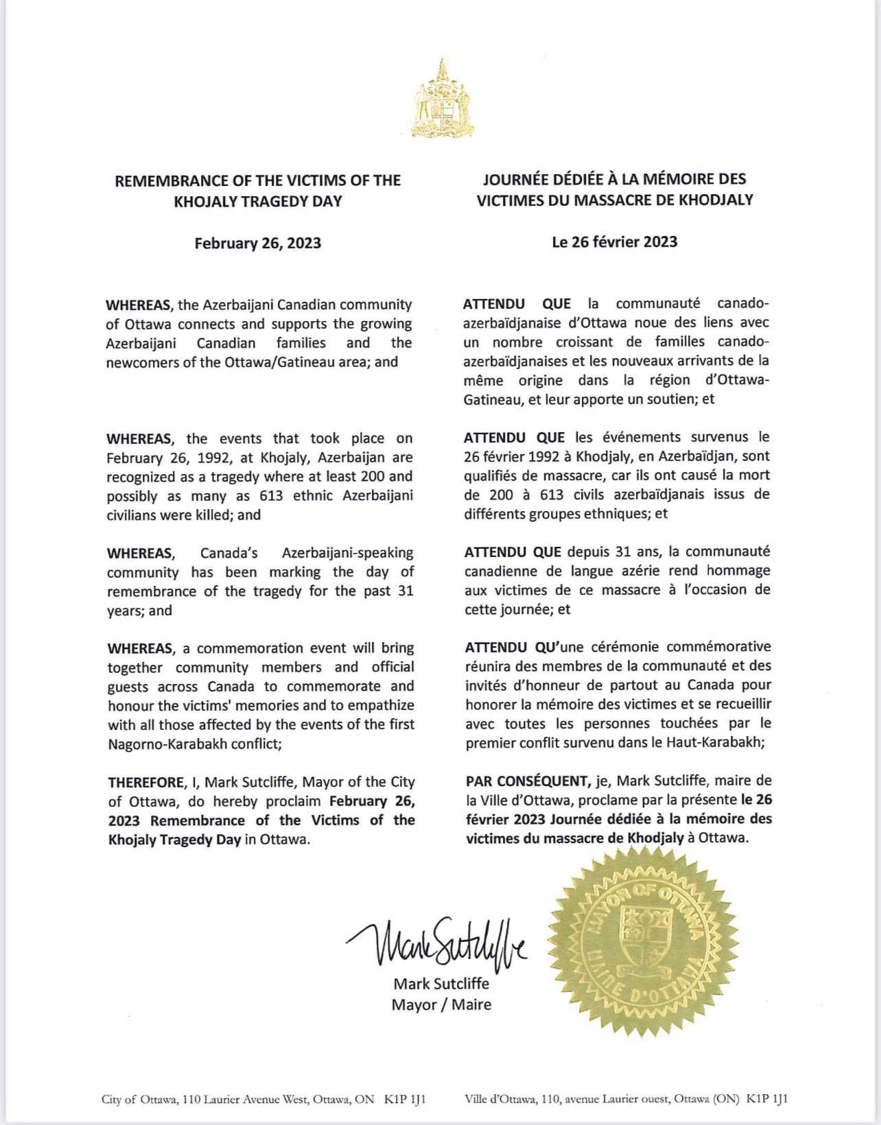 🇨🇦🇦🇿Мэр столицы Канады города Оттава объявил 26 февраля 2023 г. Днём памяти жертв Ходжалинской трагедии (Twitter-аккаунт Network of Azerbaijani Canadians).