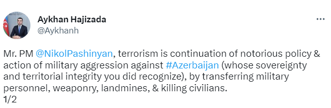 Глава пресс-службы МИД АР Гаджизаде ответил премьеру Пашиняну, который исказил факт армянской провокации 5 марта: «Господин Пашинян, терроризм – продолжение гнусной политики и военной агрессии посредством перемещения военного персонала, оружия, мин и убийства гражданского населения Азербайджана, суверенитет и территориальную целостность которого вы признали» (Twitter-аккаунт Гаджизаде).
