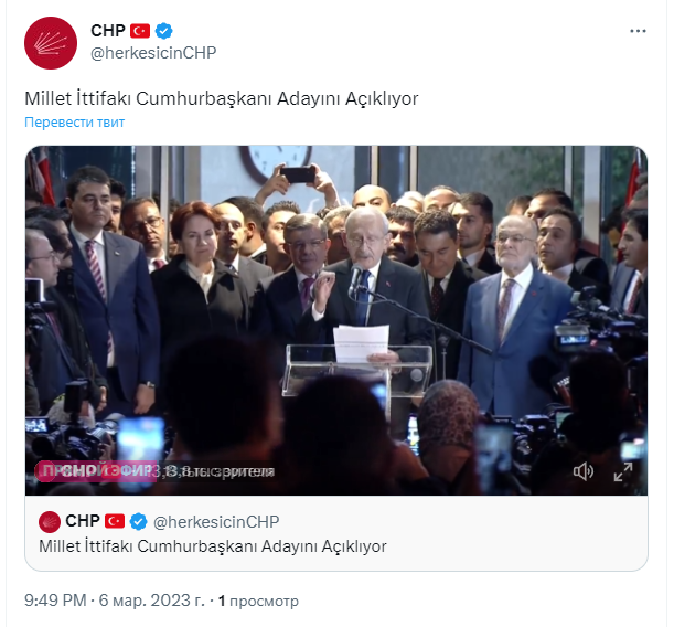 🇹🇷 Кандидатом от оппозиционного альянса Турции объявлен лидер партии СHP Кемаль Кылычдароглу