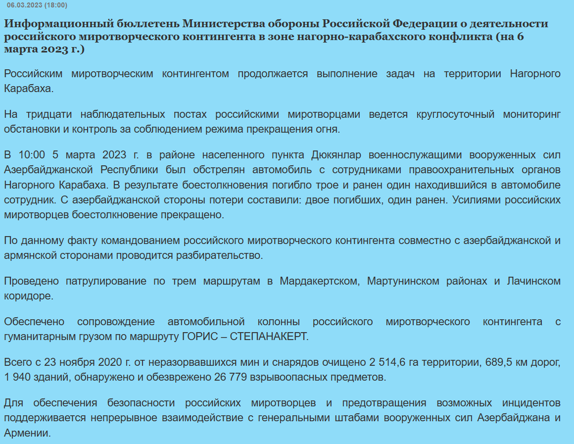 В Минобороны АР сообщили, что военное ведомство РФ искажает и распространяет недостоверную информацию об армянской провокации, произошедшей 5 марта. Отмечается, что представлять людей полностью экипированных оружием, в качестве «сотрудников полиции» - лицемерие. Распространяемая информация об эвакуации военнослужащих АР представителями военного контингента РФ также не соответствует действительности. Эвакуацию погибших и раненых осуществляли военнослужащие АР.