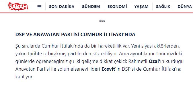 Партия Vatan и демократическая левая партия DSP присоединятся к Народному альянсу. Об этом говорится в одном из ведущих турецких проправительственных изданий - газете Sabah. Официального подтверждения на данный момент нет.