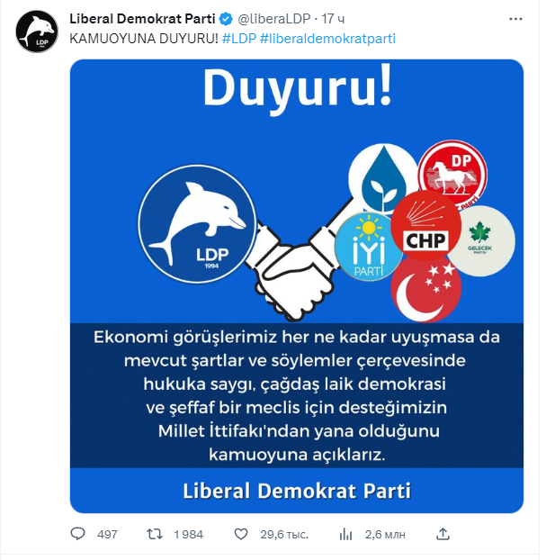 🇹🇷 Либерально-демократическая партия Турции LDP объявила о своей поддержке оппозиционного альянса на грядущих выборах, несмотря на расхождения во взглядах на экономические проблемы (Twitter-аккаунт LDP).