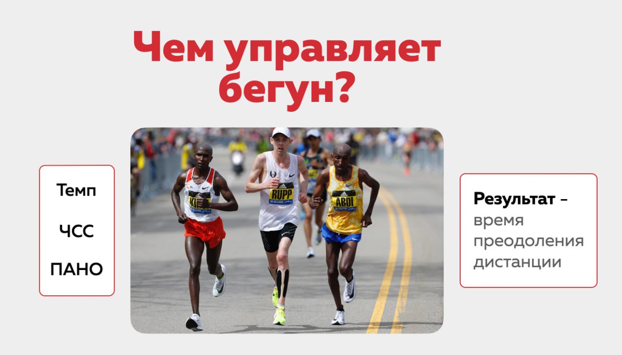 Посмотрите на слайд ниже – Чем управляет бегун? Следствием чего является время, за которое он пробежал марафон (т.е. его результат)? Чем он управляет, глядя на показатели ЧСС и темпа?