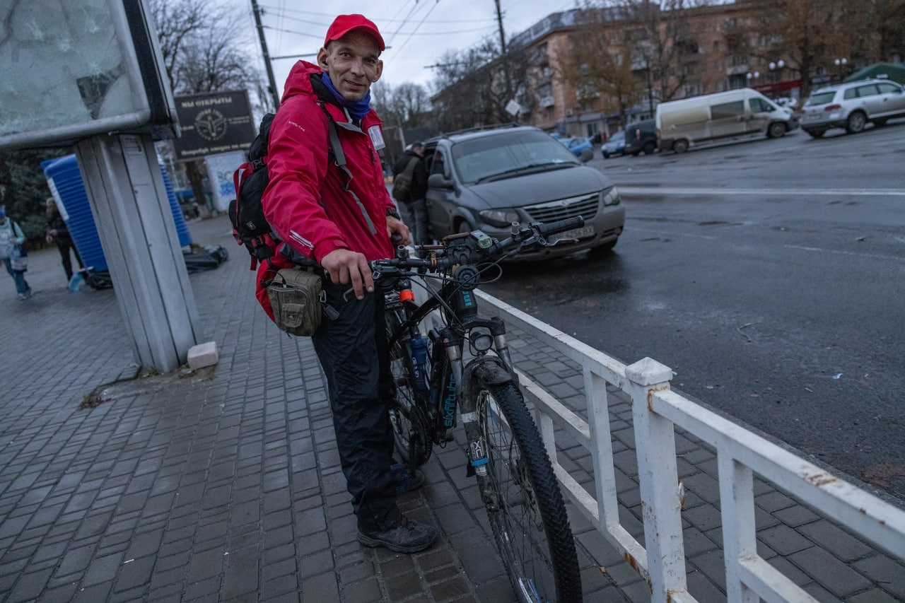 Михайлу близько сорока. Народився і живе в Херсоні. Він має інвалідність: з дитинства чує лише розмови зблизька ― дальніх звуків без слухового апарату для нього не існує. Про вибухи в місті дізнається через тремтіння стін. Коли в Херсон увійшли росіяни, він лишився, а 7 березня став веловолонтером.