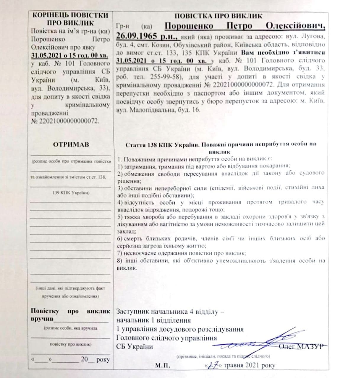 Петро Порошенко не з’явився на допит в СБУ як свідок у справі Козака — Медведчука. Його викликали повторно — на 31 травня 2021 року. Вранці 27 травня Порошенко повідомив, що він поїхав «назустріч сонцю»