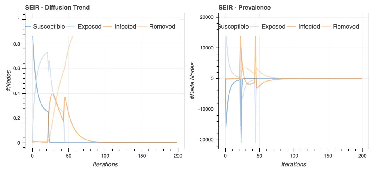 Взяли данные из открытых источников, промоделировали диффузию эпидемии в рамках стандартной имплементации SEIR-модели. Оценка получилась грубая и не очень достоверная, однако для «прикидки будет достаточно». Во-первых, для симуляции взяли граф Эрдоса-Реньи, когда по-хорошему надо было бы брать «средний» социальный граф физических взаимодействий «среднего» человека с поправкой на механизм распространения вируса через рукопожатия, половые контакты и прочее прочее. Во-вторых, взяли граф всего из 100,000 узлов т.к. все параметры в модели - относительные величины. Для большего нужно было расчехлять AWS, не только же спиннеры и швейцарские ножи покупать на Amazon’e. Но нам лень. Поиграться можно, прочитав документацию к библиотечке по ссылке выше, а с результатами ознакомиться на картинке внизу поста.