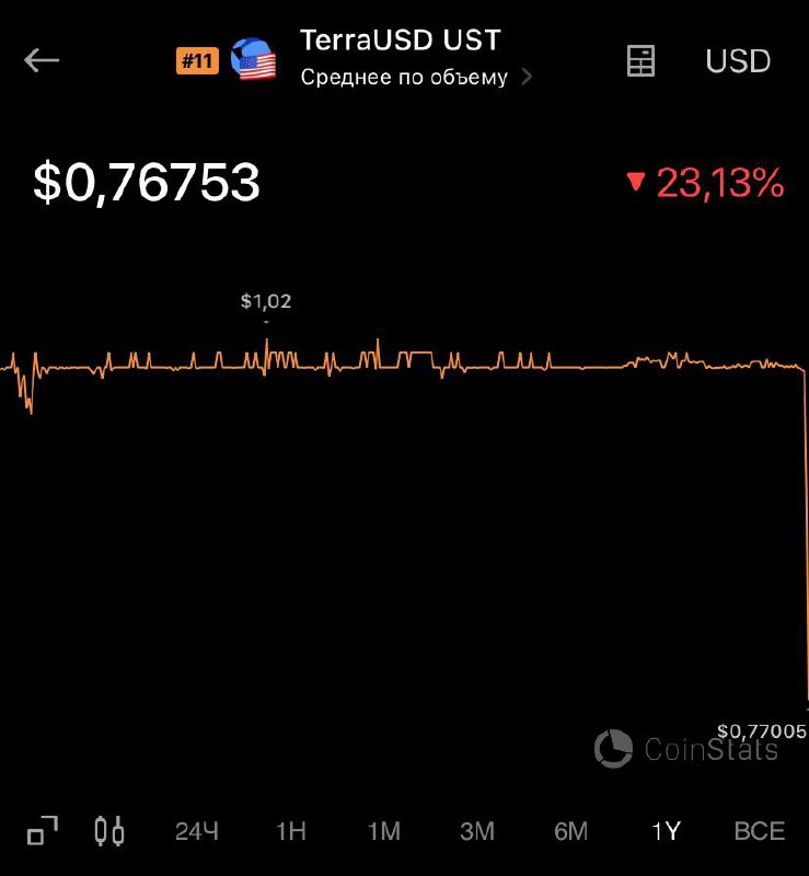 Алгоритмический стейбл UST (12 место на CMC) обеспеченный LUNA и BTC упал на 30% на фоне долгожданной коррекции рынка