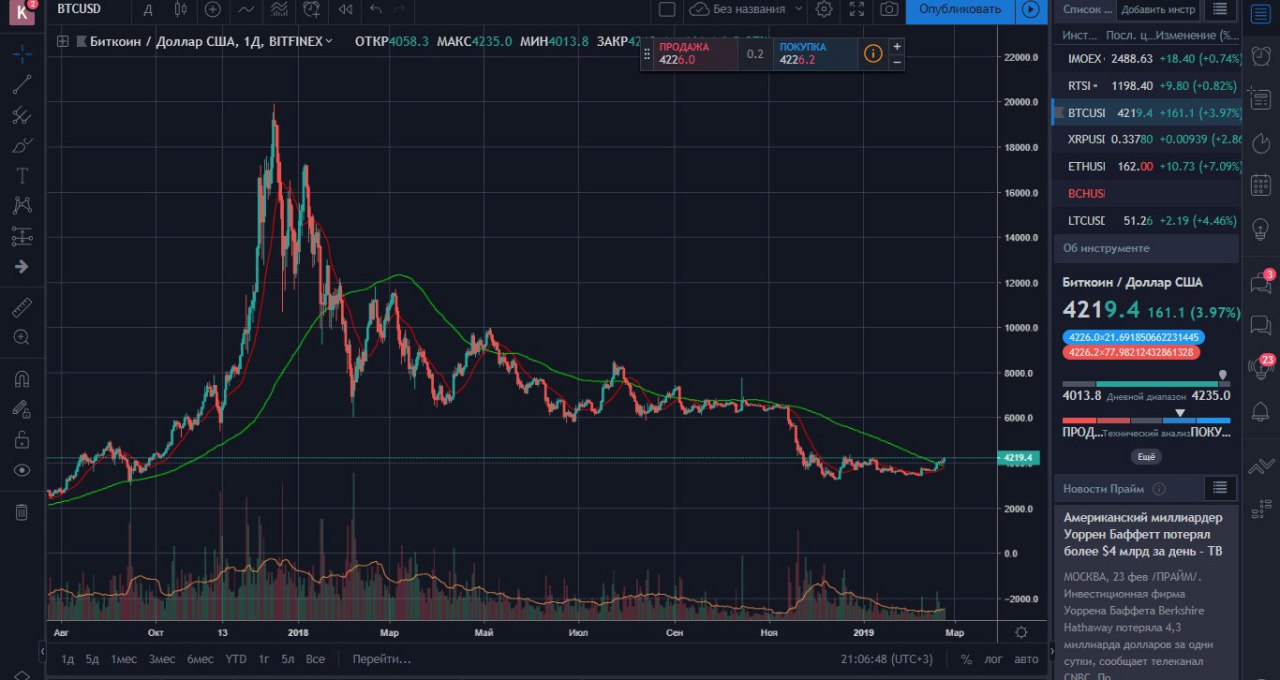 Цена BTC преодолела отметку в 4000$ достигнув уровня в 4200$ о чем я и предупреждал в прошлой публикации. Одновременно с этим за последние сутки существенно выросло число длинных позиций по биткоину на бирже Bitfinex - выше 26 тысяч BTC. Число коротких позиций обновило очередной минимум на отметке в 18,3 тысяч BTC. Теперь, в ближайшее время нам стоит ждать снижение стоимости BTC, 14-дневный RSI вошел в зону перекупленности выше 70 + аналогичное движение показал и Stochastic.