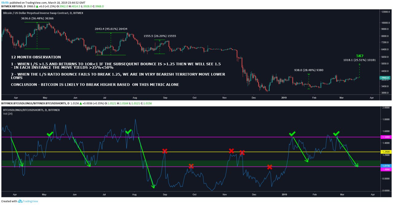 Соотношение шортов и лонгов на Bitfinex указывает на движение биткоина к отметке $5000.