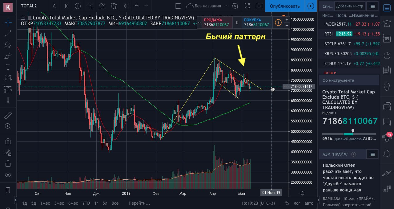 Однако многих инвесторов волнует ситуация, которая сложилась с альткоинами, поскольку в последние шесть месяцев они сильно обесценились по отношению к биткоину. ТОП-10 монет (за исключением USDT) в течение 30 дней потеряли более 10% стоимости в паре с BTC. Складывается впечатление, что другие монеты интересуют инвесторов меньше, чем биткоин, однако на графике совокупной капитализации альткоинов на данный момент сформировался бычий флаг, который, по законам технического анализа, предшествует росту. Показателю необходимо преодолеть сопротивление на уровне $73,65 млрд для подтверждения фигуры. Лучшая ситуация у Litecoin, которому благоволят и фундаментальные факторы в лице приближающегося халвинга. Так, актив уже осуществил прорыв нисходящего канала и в преддверии события может преодолеть отметку в $100.