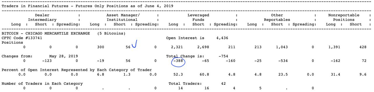 В новом отчете за период с 28 мая по 4 июня мы наблюдаем крайне малое закрытие длинных позиций со стороны институционалов (Asset Manager) в количестве 19 контрактов. Крупная позиция в 300 лонгов, несмотря на рыночную турбулентность, все еще сохраняется. Также спустя несколько недель появились первые шорты в объеме 56 контрактов. Это 18% по отношению к лонгам. Интересно, что быки в разделе Asset Manager не открыли хеджевые позиции (спрединг 0). Обратите внимание на то, что Leveraged Funds закрыли приличное число длинных позиций за этот период падения с уровня 9000$. Примерно на 17% от предыдущего значения. Таким образом, мы имеем вновь подскочивший разрыв в пользу шортов. С другой стороны мы также видим сокращение спрединга, что говорит о бычьем настрое, если закрыть глаза на остальные факторы. Обратите внимание на объем дневной проторговки за этот период. Начиная с 28 мая он пошел на спад. Текущий объем даже ниже показателей начала мая. Это говорит о спаде ажиотажа. В заключение надо отметить несколько важных моментов. Прежде всего, рост не может быть вечным, и периоды рыночных консолидаций, кратковременных падений - абсолютно естественны. Идет фиксация прибыли, отработка спекулятивных шортов от ключевых уровней ценового сопротивления до уровней поддержки, стоп-лоссы новых лонг позиций со стороны хомяков. Все это давит на рынок. Крупные игроки на CME уверенно сохраняют свой бычий настрой. Так что, если судить лишь по фьючерсному отчету, лонг-настроения преобладают. Однако, не забываем про комплексный анализ рынка и риск-менеджмент.