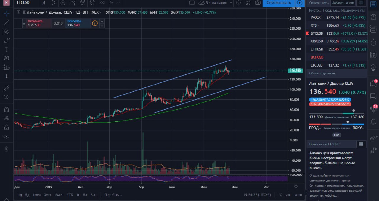 Litecoin движется над Облаком индикатора Ichimoku Kinko Hyo, это указывает на наличие восходящей тенденции. Здесь же, котировки постоянно отталкиваются от сигнальных линий индикатора, что указывает на силу текущей тенденции. В качестве основной торговой идеи на дневном графике стоит ожидать попытку снижения и теста ближайшего уровня поддержки $124 и далее, продолжение подъема с первой целью $146. Пробой данной области укажет на ускорение роста к следующей цели на уровне $187. На 4-часовом графике Litecoin движется в рамках восходящего канала. На данный момент мы наблюдаем отскок от нижней границы канала, что укажет на потенциал для продолжения роста. В пользу такого подъем выступает тест линии тренда на индикаторе RSI. Подтверждением подъема выступит пробой нисходящей линии сопротивления на индикаторе и закрытие котировок над уровнем $146.