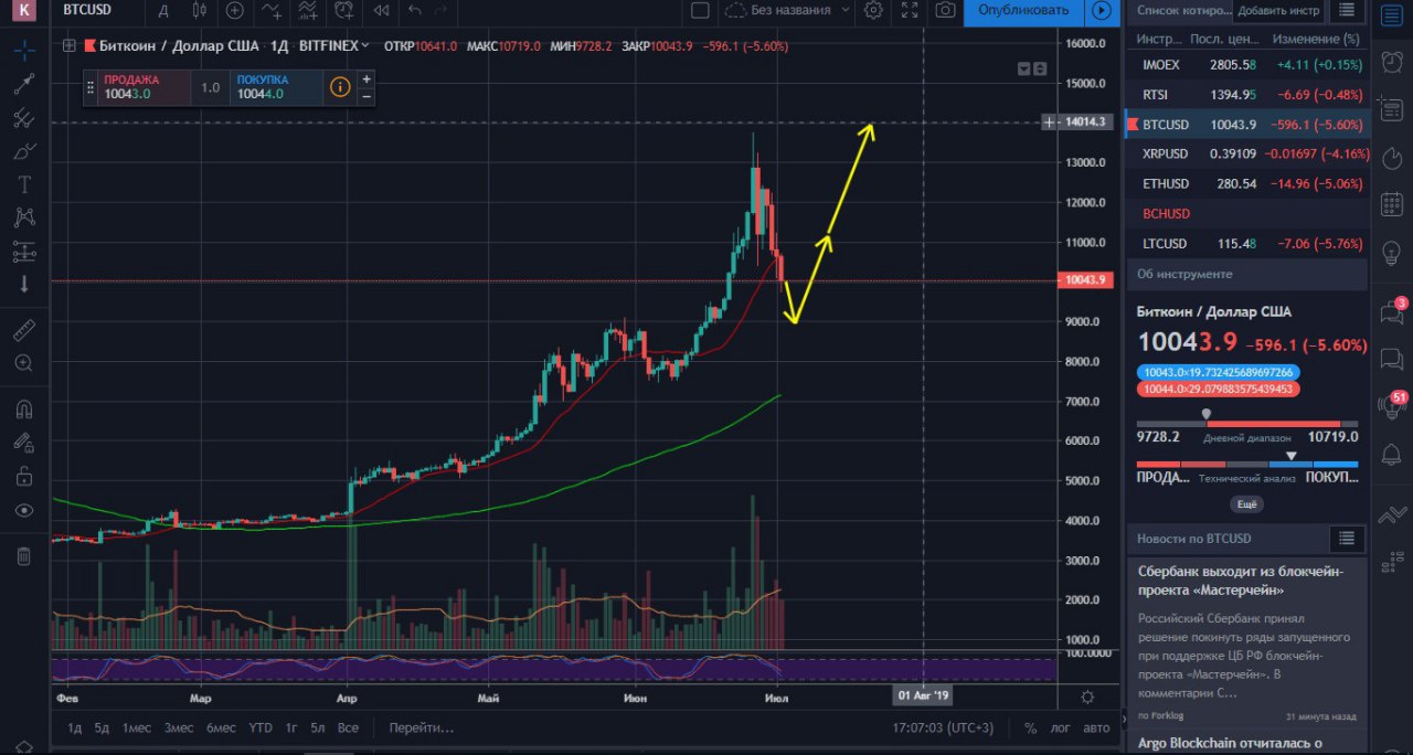 BTC продолжает движение в рамках нисходящей коррекции, однако у актива есть четкие предпосылки к росту в ближайшие дни! В качестве основной торговой идеи на дневном графике стоит ожидать попытку снижения и теста ближайшего уровня поддержки $9200 и далее, продолжение подъема с первой целью $11200. Пробой данной области укажет на ускорение роста к следующей цели на уровне $14000. В пользу такого подъема выступает тест линии тренда на индикаторе RSI. Также стоит упомянуть полугодовые фьючерсы, расчеты по которым произошли 1 июля, а при открытии новых цена на бычьем рынке как правило идет вниз для входа в сделку "по-дешевле" и как правило заработка "по-больше". Учитывая что новые контракты можно открывать с 3 июля, то и цена первой криптовалюты после этой даты скорей всего прекратит свое падение.