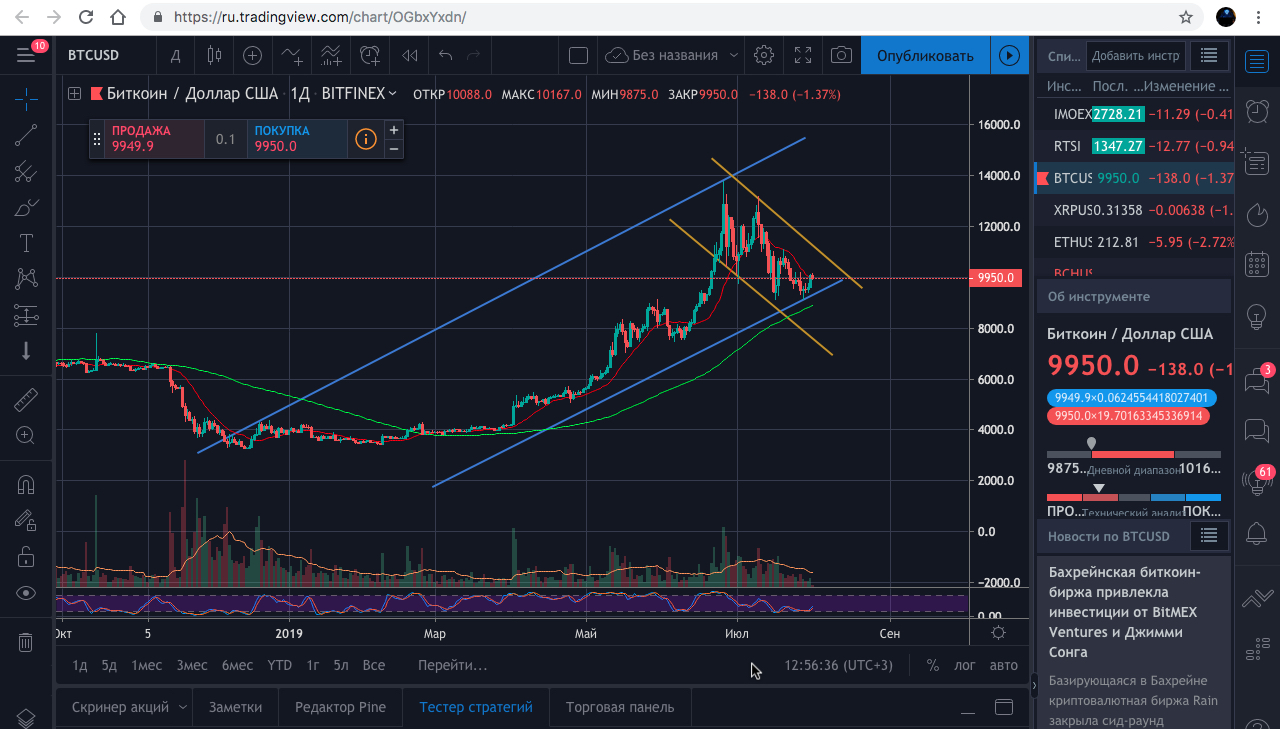 Котировки BTC продолжают корректироваться в рамках модели «Треугольник». В очередной раз произошел тест области скользящих средних, и на данный момент мы наблюдаем отскок. Это по-прежнему указывает на силу быков, которые удерживают ключевую область поддержки - $9200. В качестве основной торговой идеи стоит ожидать теста нижней границы модели и попытки движения вверх к первой цели на уровне $13 900. На 4-часовом графике ведущий цифровой актив продолжает движение в рамках нисходящего канала. Не стоит исключать еще одну попытку падения и теста уровня $9550 перед началом роста. Дополнительным сигналом в пользу отскока вверх здесь выступит тест нижней границы нисходящего канала на RSI. Как видим, ранее такой тест спровоцировал сильный рост курса. В качестве подтверждения развития подъема станет пробой уровня сопротивления на $11 005. Однако к полноценному возврату в рамки бычьей тенденции можно будет говорить только с пробоем верхней границы нисходящего канала.