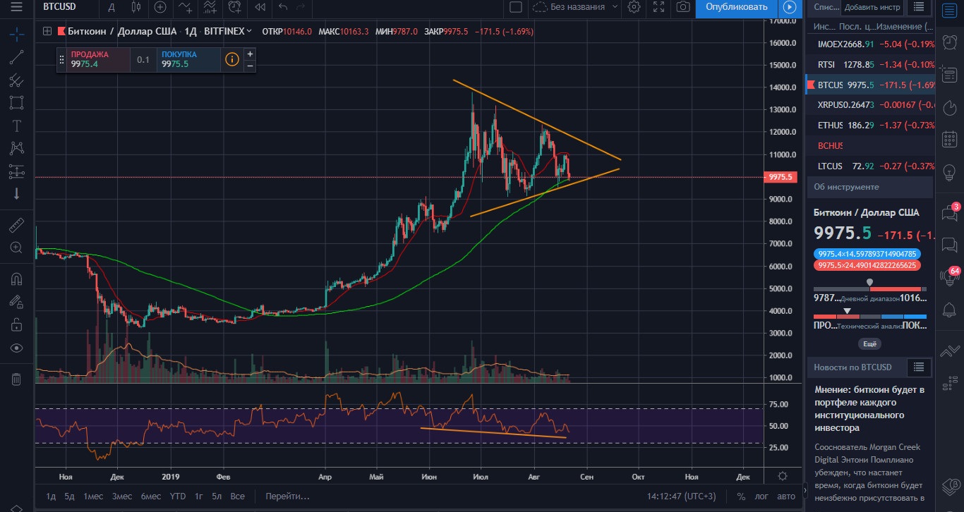 В понедельник цена биткоина выросла на 6%, пробив нисходящий треугольник, что указывает на вероятность роста. Однако рост не был подкреплен высокими объемами торгов, что с технической точки зрения поставило его под сомнение. Тем не менее уже на следующий день котировки обновили 13-дневный максимум, а объемы достигли уровня 15 августа. Именно это говорит в пользу дальнейшего движения к уровню $10 956 в течение следующих суток, двух. Одновременно с этим, на дневном графике гистограмма MACD преодолела отметку 0, индикатор RSI поднялся выше 50, а 5- и 10-дневные скользящие средние пересеклись в пользу покупателей. Но если же цена закрепится ниже $10 286 на часовом графике, это сразу укрепит позиции продавцов и на недельном графике, поскольку откроет путь к отметкам ниже $10 000. Кстати, на недельном графике наблюдается неблагоприятная для покупателей ситуация: 5- и 10-недельная пересеклись в пользу продаж, а гистограмма MACD впервые с февраля опустилась ниже 0.