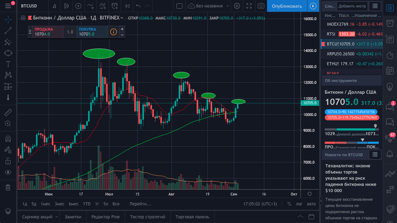 Теханалитик: низкие объемы торгов указывают на риск падения биткоина ниже $10 000.