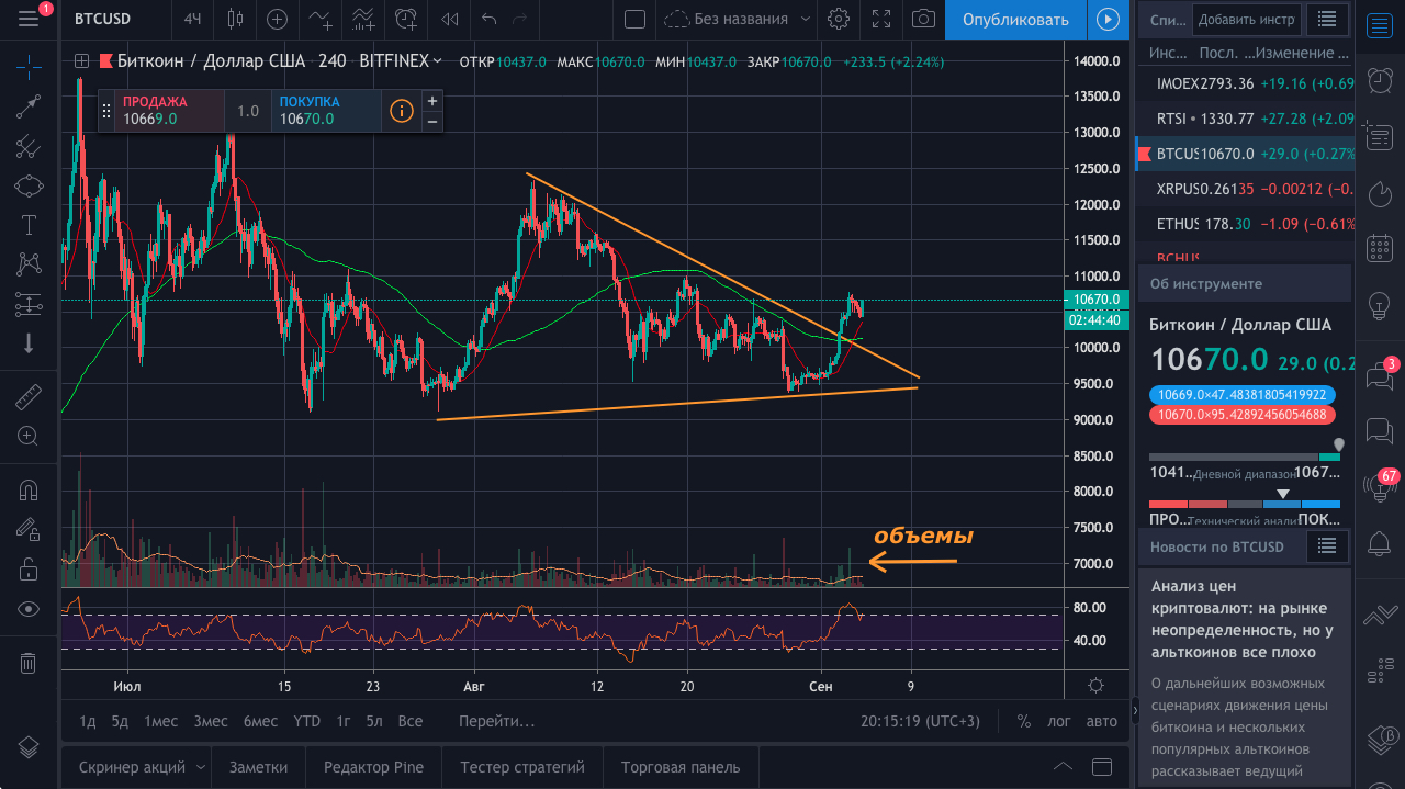 В понедельник цена биткоина выросла на 6%, пробив нисходящий треугольник, что указывает на вероятность роста. Однако рост не был подкреплен высокими объемами торгов, что с технической точки зрения поставило его под сомнение. Тем не менее уже на следующий день котировки обновили 13-дневный максимум, а объемы достигли уровня 15 августа. Именно это говорит в пользу дальнейшего движения к уровню $10 956 в течение следующих суток, двух. Одновременно с этим, на дневном графике гистограмма MACD преодолела отметку 0, индикатор RSI поднялся выше 50, а 5- и 10-дневные скользящие средние пересеклись в пользу покупателей. Но если же цена закрепится ниже $10 286 на часовом графике, это сразу укрепит позиции продавцов и на недельном графике, поскольку откроет путь к отметкам ниже $10 000. Кстати, на недельном графике наблюдается неблагоприятная для покупателей ситуация: 5- и 10-недельная пересеклись в пользу продаж, а гистограмма MACD впервые с февраля опустилась ниже 0.