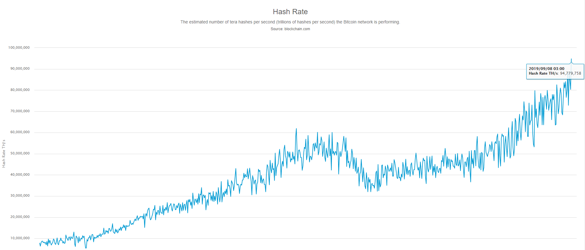 На момент написания показатель составляет 102,848 EH/s. С декабря 2018 года хешрейт вырос на 230%. Многие аналитики считают, что цена следует за хешрейтом, однако в ночь на 19 сентября котировки вновь упали ниже $10 000, но это скорей манипуляция и в ближайшее время курс вернется на прежний уровень.
