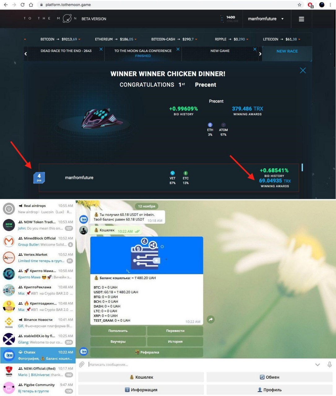 Ребят, как и обещал в обзоре на игру To The Moon, публикую свой результат участия в бесплатном турнире. Я занял четвертое место, хотя изначально был на втором, и выиграл 69 TRX на баланс игры, но команда проекта также обещала, что обменяет 1:1 монеты Трона на USDT, поэтому я получил еще чуть более 60$ на баланс обменника (часть съела комиссия за перевод), после чего успешно вывел все на Binance. Если кто не понял, то сутью обзора и были эти самые бесплатные турниры, где вы можете не потратив ни цента выиграть нелохую сумму (по факту, это такой себе Airdrop).