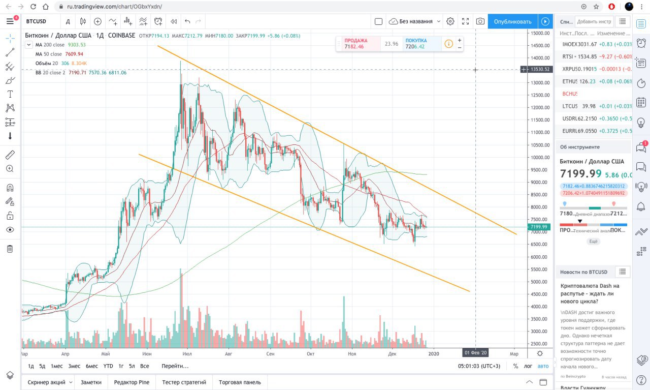 На дневном графике котировки биткоина вновь смогли оттолкнуться от верхней границы Полос Боллинджера, что указывает на сохраняющееся давление со стороны медведей. В качестве основной торговой идеи стоит ожидать снижения котировок к уровню поддержки на $6800, а затем начала роста к потенциальной цели на уровне $9800. Подтверждением росту станет пробой верхней границы нисходящего канала и закрепление котировок над уровнем $8355. Но последние дни на учасников рынка массово давят негативным новостным фоном, половина из которого явно фейк и преувеличение:
