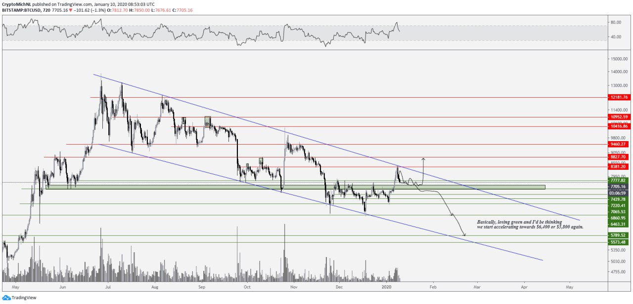 Трейдер Crypto Michaël представил два сценария, согласно которым цена первой криптовалюты с большой вероятностью будет следовать в ближайшее время. Согласно оптимистичному прогнозу, BTC вскоре подорожает до $9500, но для этого цене нужно некоторое время продержаться над диапазоном поддержки $7500-7600.
