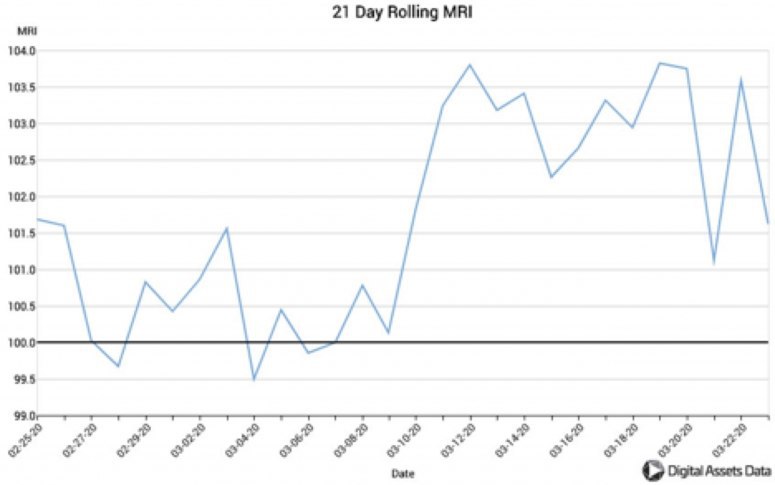К 15 марта курс биткоина поднялся от $3 867 до $7 000 за всего 13 дней. В это время майнеры продавали больше монет, чем добывали, пишет CoinDesk со ссылкой на индикатор прокрутки ресурсов майнеров (MRI). 21-дневный MRI оставался выше 100 на всём протяжении восстановления биткоина от недавних минимумов. Показатель выше 100 означает, что майнеры продают больше BTC, чем добывают, и таким образом сокращают свои резервы. В частности, в среду они продали 2 788 монет против 1 588 добытых, сокрушая рынок, но он их принял и это бычий сигнал, так как цена BTC в этот день опустилась всего на $200, но впоследствии вернулась обратно. Аналитики CoinDesk отмечают, что рост не ограничивался одним днём, а наблюдался на протяжении двух последних недель, что позволяет выдвинуть гипотезу о вероятном продолжении ралли. За этот же период, из-за убытков, сеть биткоина покинули почти половина майнеров, даже пересчёт сложности не изменил ситуацию, поэтому остальным приходится продавать монеты из резервов чтобы держатся на плаву, но долго это продолжаться не сможет, а значит подъем не за горами.